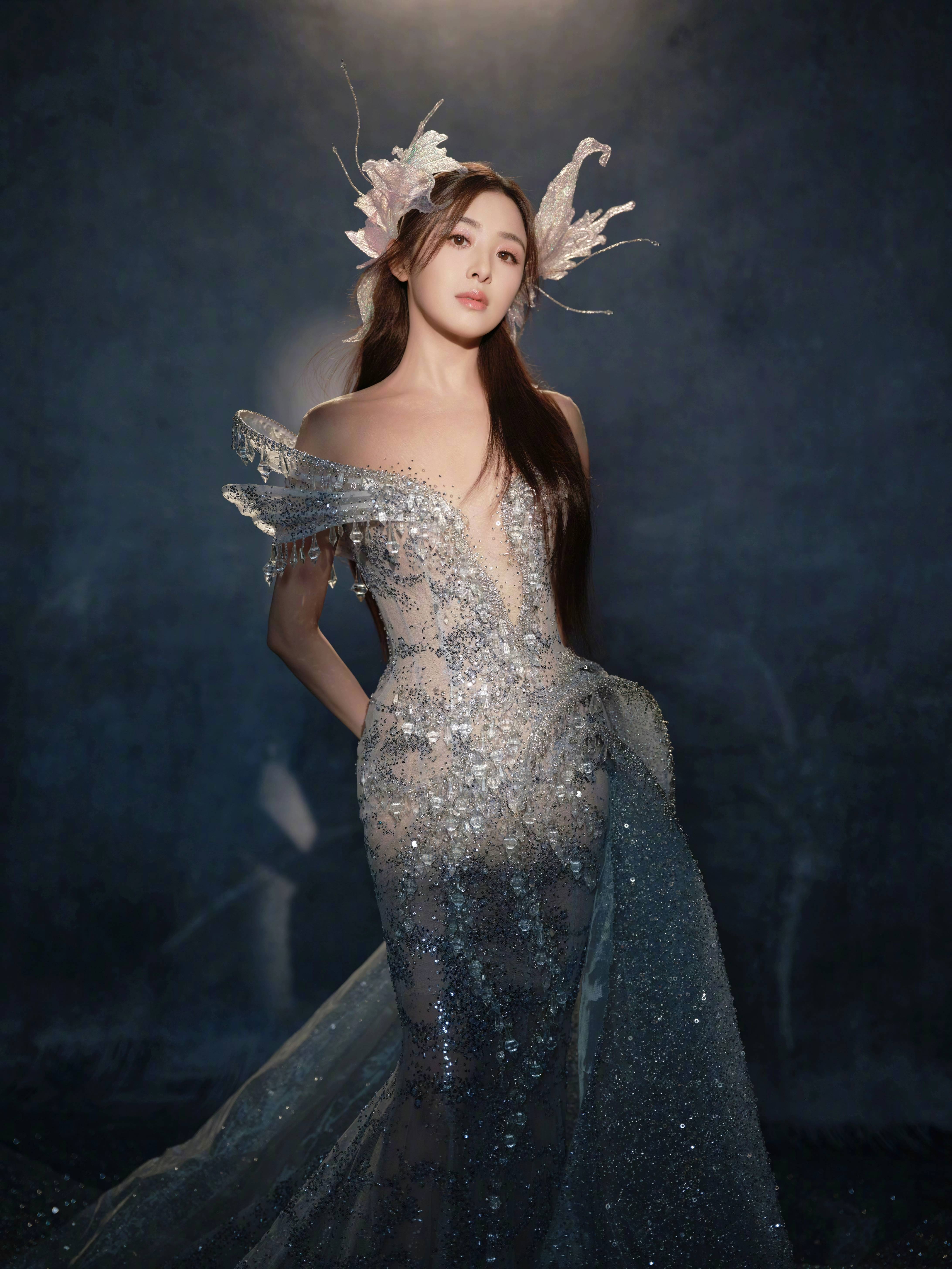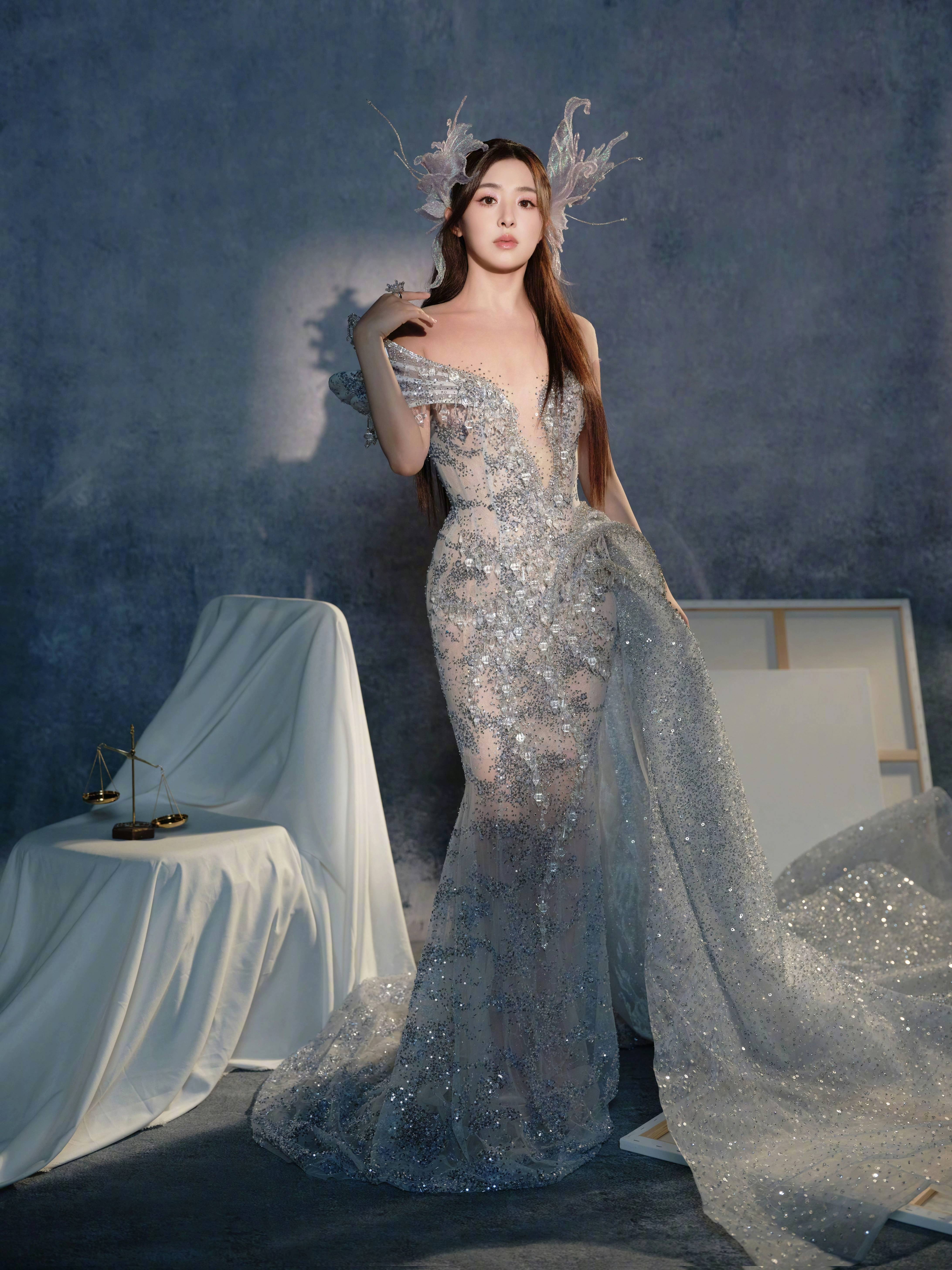 人鱼剪裁的曼妙撞上水晶装饰的璀璨,搭配精灵感头饰,在艺术感满溢的场景里,将高定风格的奢华与童话感的空灵揉得震撼人心。每一次驻足,都是时尚与艺术共鸣的缪斯瞬间。